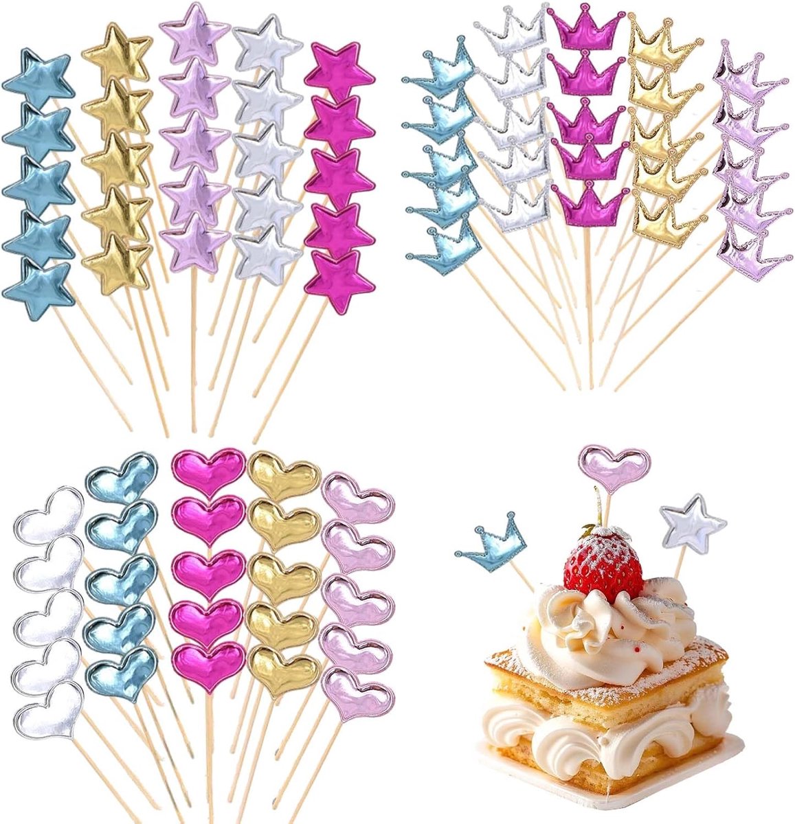 Waarom Kiezen voor Onze Taarttoppers? Met onze unieke ster en hartvormige kroon taarttoppers maak je van elke traktatie een feestje. Ze zijn niet alleen een lust voor het oog, maar ook een praktische oplossing voor snelle en mooie decoratie. Laat je creativiteit de vrije loop en geef je gebakjes de uitstraling die ze verdienen met deze schitterende toppers!
