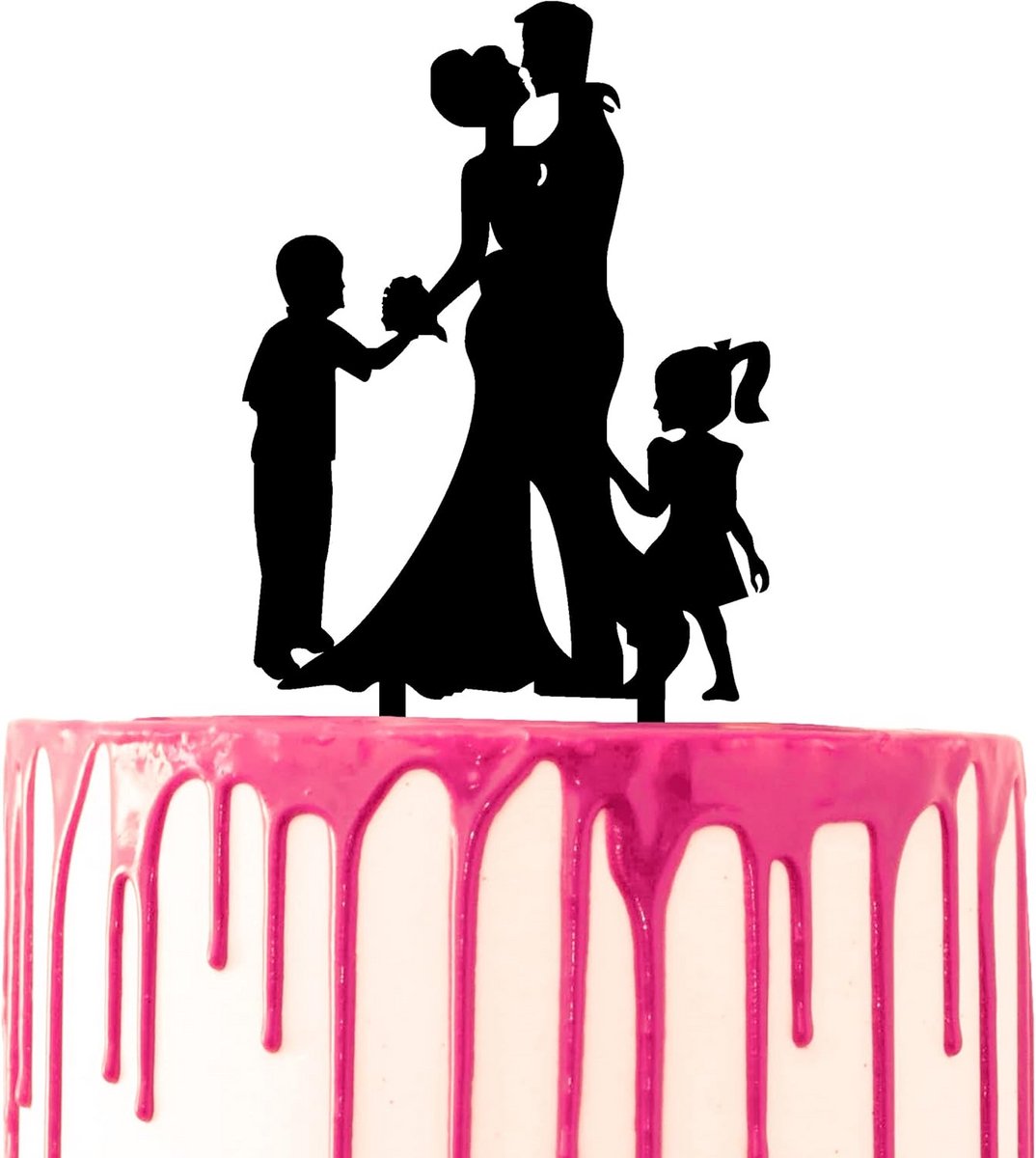 Maak uw bruidstaart compleet met deze prachtige, kwalitatieve taarttopper. Dit unieke decoratiestuk toont een bruidspaar met een jongen en een meisje die elkaars hand vasthouden, uitgevoerd als een stijlvol acryl of houten silhouet. Ideaal voor bruiloften, jubilea en huwelijksceremonies. Deze topper is gemaakt van hoogwaardig materiaal en is verkrijgbaar in verschillende afmetingen om perfect bij uw taart te passen. Een onvergetelijk aandenken en een elegant cadeau voor het bruidspaar.
