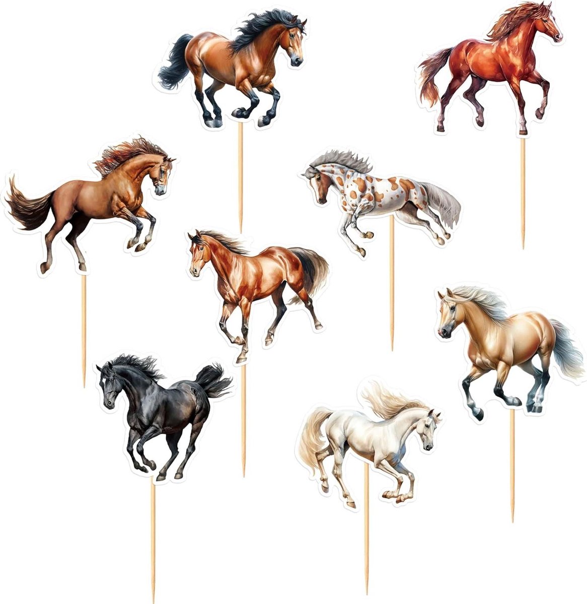 Met de set van 8 taarttoppers van Eight Stallions 8 Horses tover je je desserttafel om tot een levendige racebaan, met paarden in verschillende kleurbewegingen voor een diverse en inclusieve uitstraling.