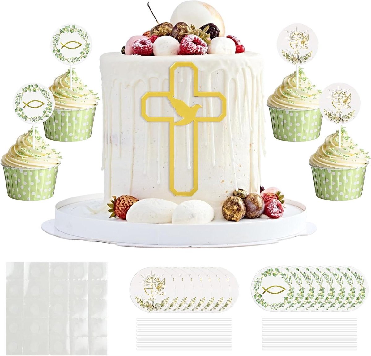 Thelau – 25 stuks vis communie taarttoppers, duif kruis taarttoppers, gouden kruis taartdecoratie voor bruiloft en feestvieringen