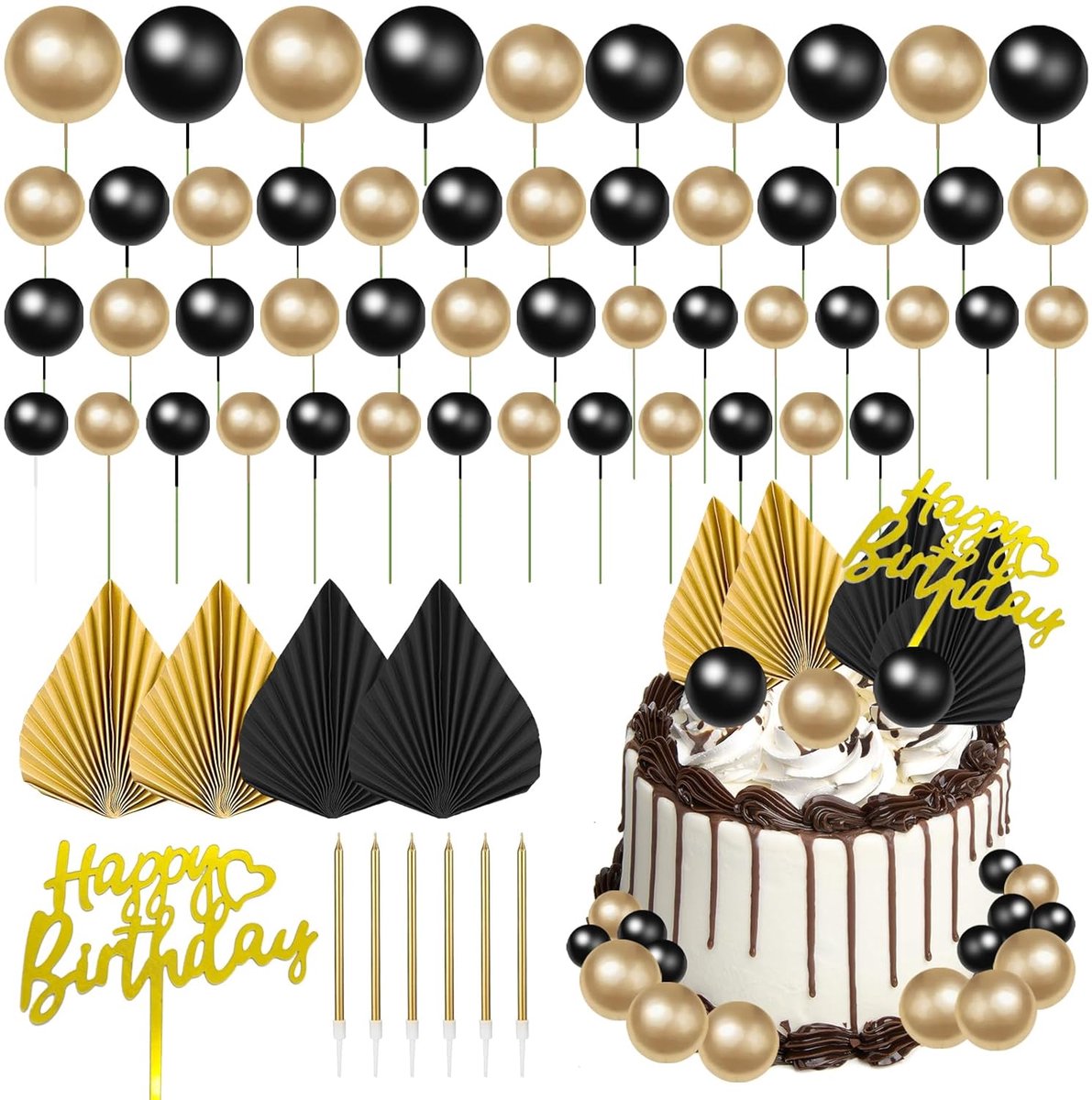 TRANKIELO® – Elegante Bolvormige Taarttoppers Set – Zwart en Goud – 61 Stuks – Ideaal voor Verjaardagen, Bruiloften en Babyshowers