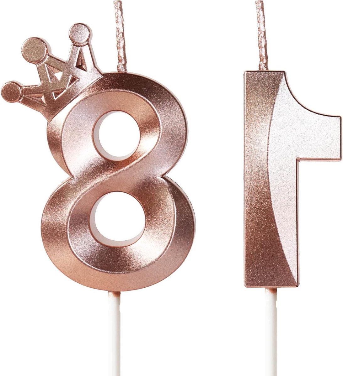 Informatie over kaars: Wordt geleverd met 2 stuks roségouden cijferkaarsen kroon ontworpen met de nummers 1 en 8. De grootte van de cijferverjaardagskaars bedraagt ca. 5 cm lang, totale lengte (inclusief kaarspuistjes) bedraagt ca. 11,5 cm, juiste maat als taartdecoratie voor de meeste verjaardags- en bruiloftstaarten.