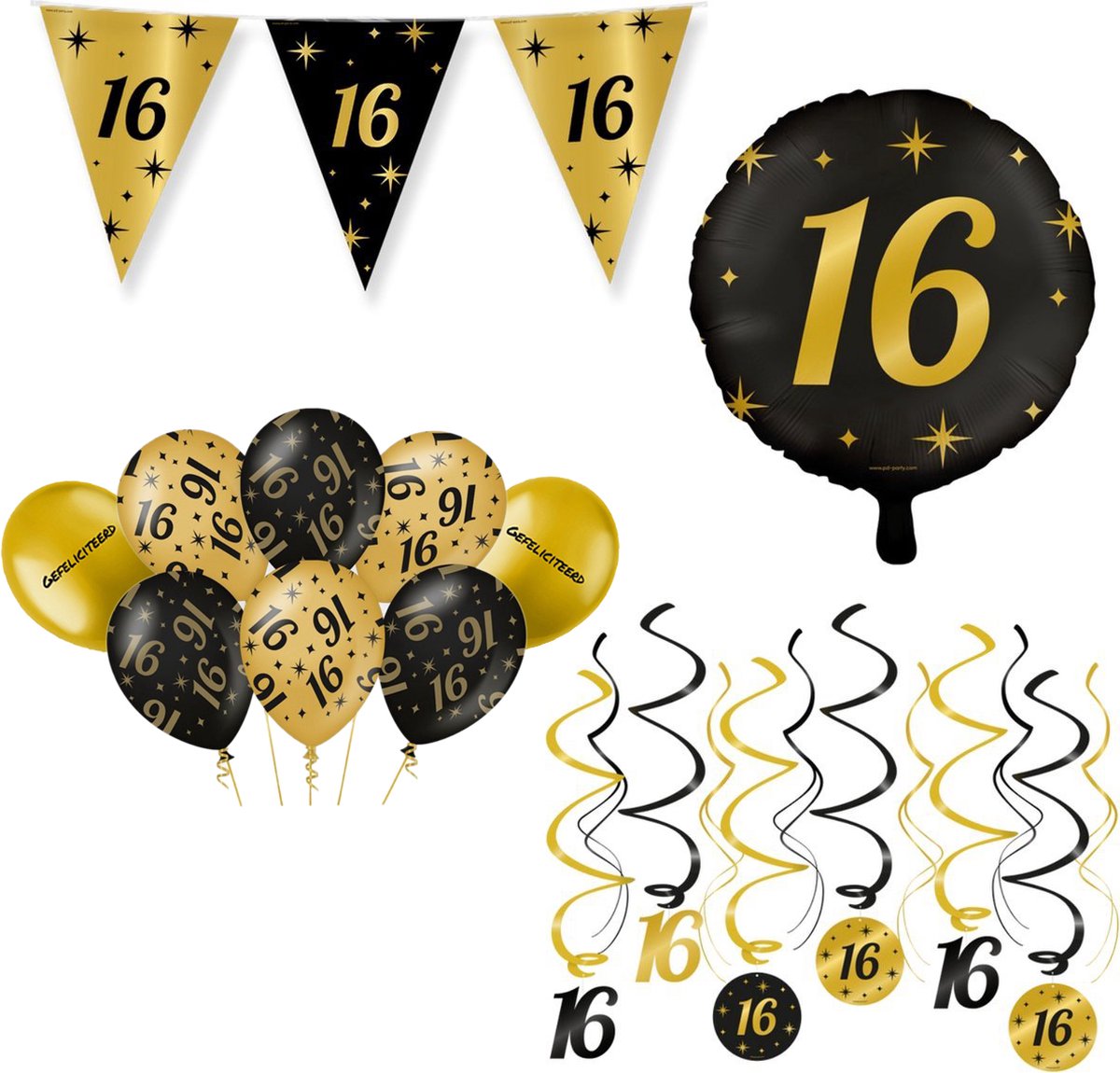 16 Jaar Verjaardag Decoratie Versiering – Feest Versiering – Swirl – Folie Ballon – Vlaggenlijn – Ballonnen – Man & Vrouw – Zwart en Goud