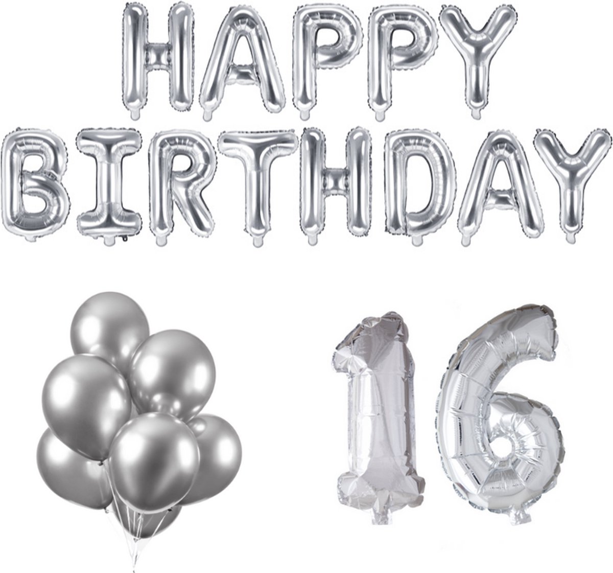 In de verpakking ontvang je cijferballonnen 16 (66cm), 10 Zilveren spiegel ballonnen, Zilveren Happy Birthday letter ballonnen (340x35cm) en Zilveren lint van 20 meter.