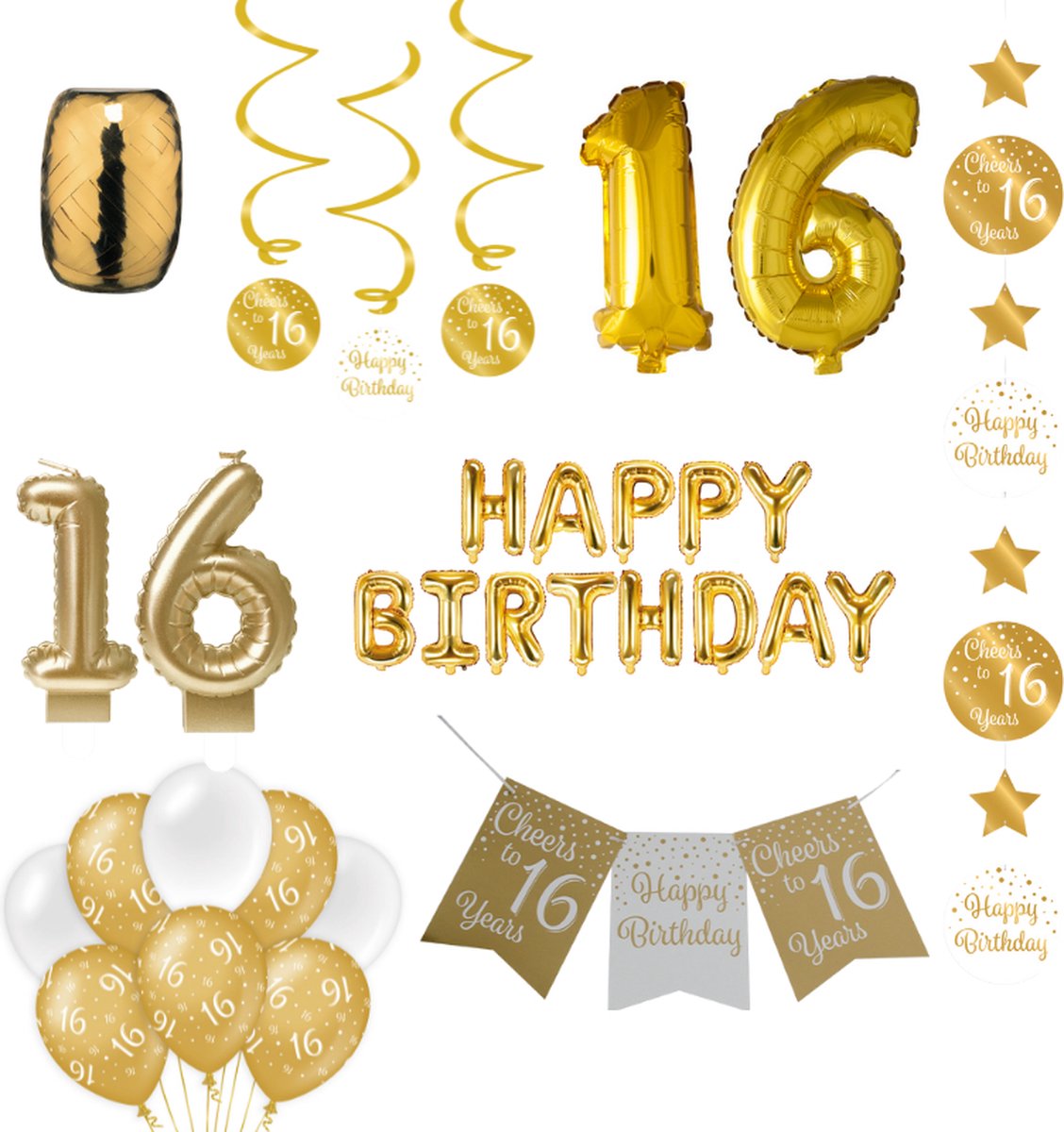 16 jaar Verjaardag Versiering pakket Gold. Vier je de verjaardag voor iemand die 16 jaar wordt? Met dit verjaardag versiering pakket versier je de verjaardag op een super mooie manier. In de verpakking ontvang je: Happy Birthday folieballon, cijferballon (41cm), lint, 3 Swirl decoraties, Hang decoratie, vlaggenlijn, cijferkaasren en verjaardag ballonnen.