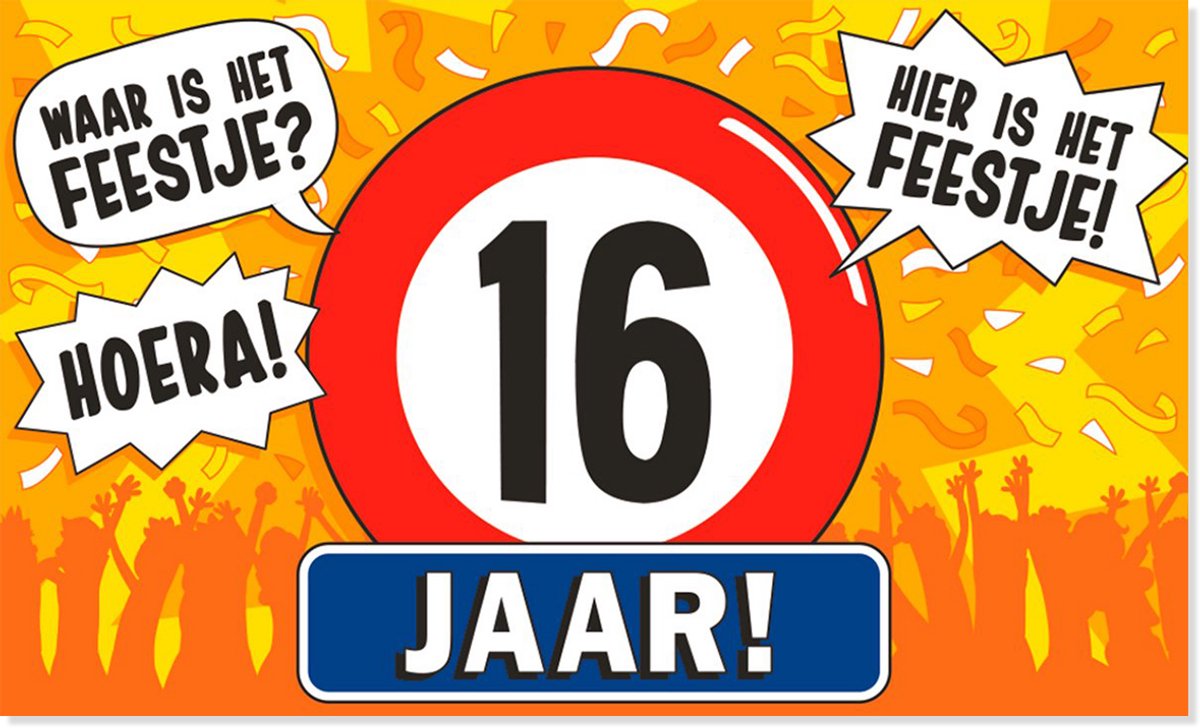 Maak van jouw 16e verjaardag een echte eyecatcher Met deze feestelijke XXL gevelvlag breng je direct de ultieme feeststemming naar buiten of binnen. Perfect voor vlaggenstok, muur, tuin of gevel, iedereen kan zien dat er iets bijzonders te vieren valt. Of je nu kiest voor binnen of buiten, deze vlag staat garant voor kleur, sfeer en een vrolijke uitstraling.