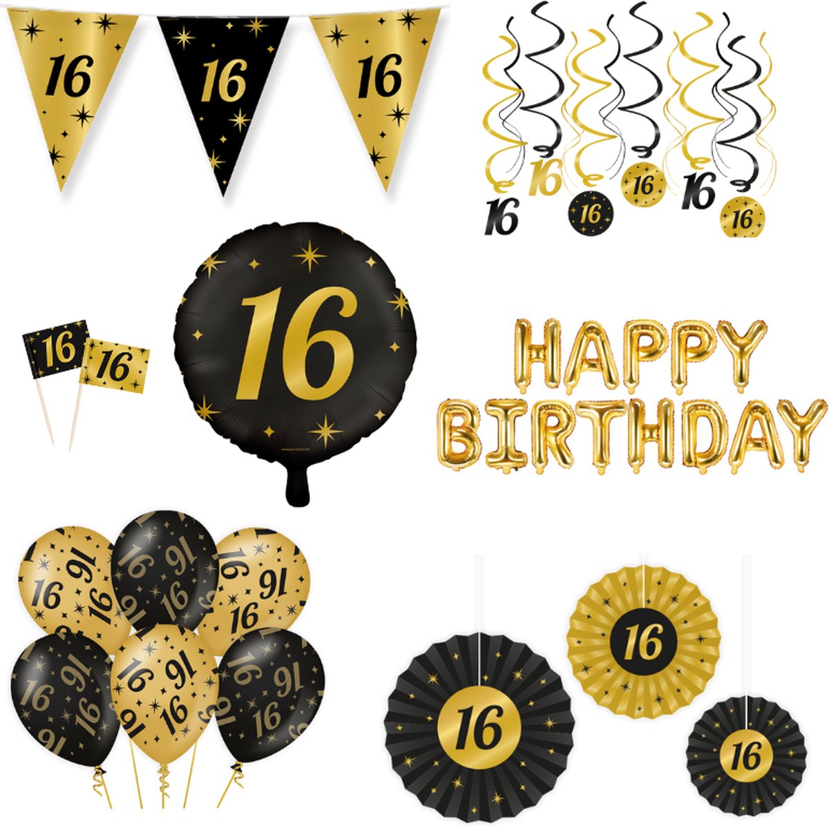 Classy Party 16 jaar verjaardag versiering pakket. Vier een 16 jaar verjaardag op een unieke manier met dit mooie en luxe Classy Party 16 jaar verjaardag versiering pakket in de kleuren goud en zwart. In de verpakking ontvang je een vlaggenlijn van 10 meter, een folieballon (45cm, leeg bezorgd), 6 Swirl decoraties, 3 fan decoraties/ waaiers, 50 cocktailprikkers Folie letterballonnen in de kleur goud (340x35cm, leeg bezorgd), gouden lint en 6 mooie luxe ballonnen (30xm)