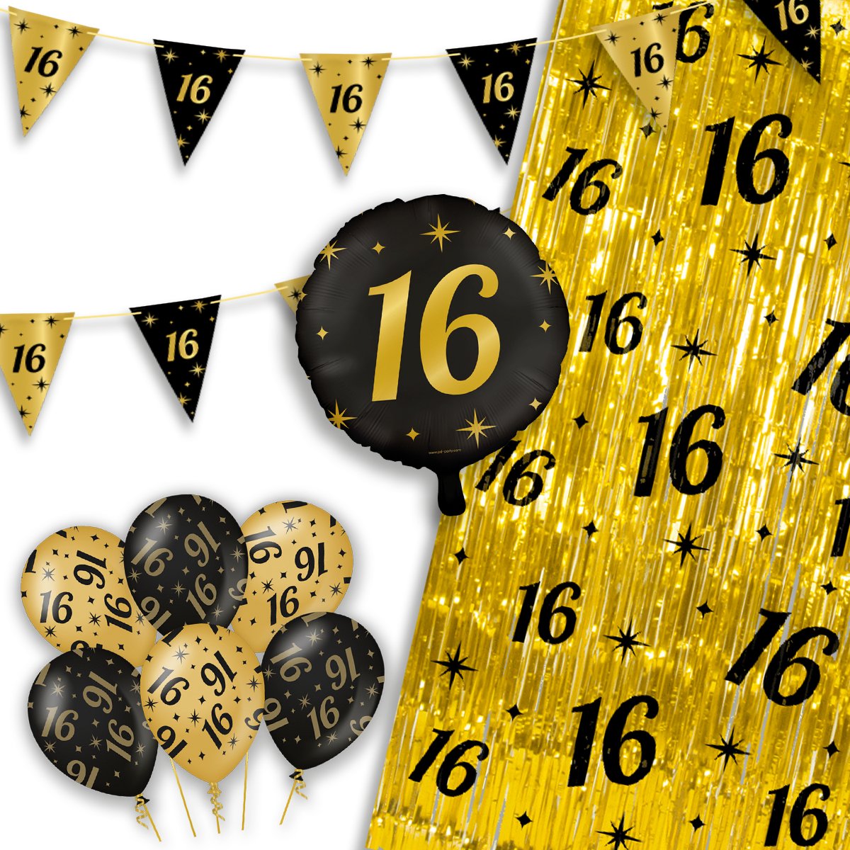LUQ – Party Essentials 16 Jaar – Zwart-Goud Verjaardag Feest Versiering – Luxe Ballonnen-Slingers-Vlaggenlijn-Gordijn