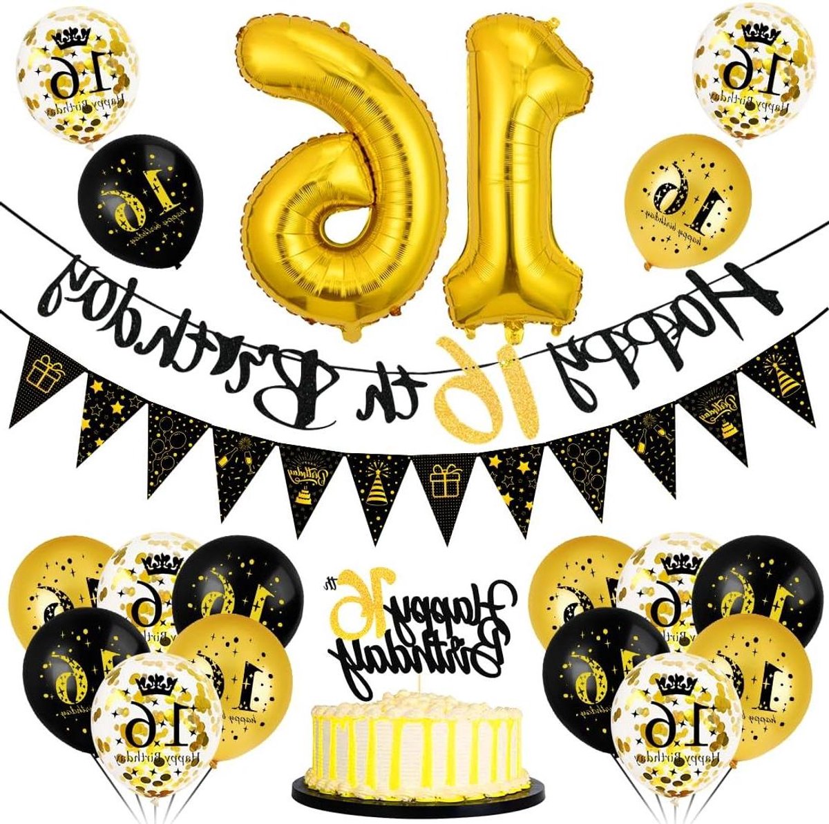 Met deze zwart-gouden verjaardagsset kan je eenvoudig je huis versieren voor een 16e verjaardag. Hang de driehoekige banners en vlaggen op aan de muur, het plafond, de tuin of waar je maar wilt. De zwarte en gouden ballonnen kunnen je helpen om je woonkamer en slaapkamer feestelijk te decoreren.