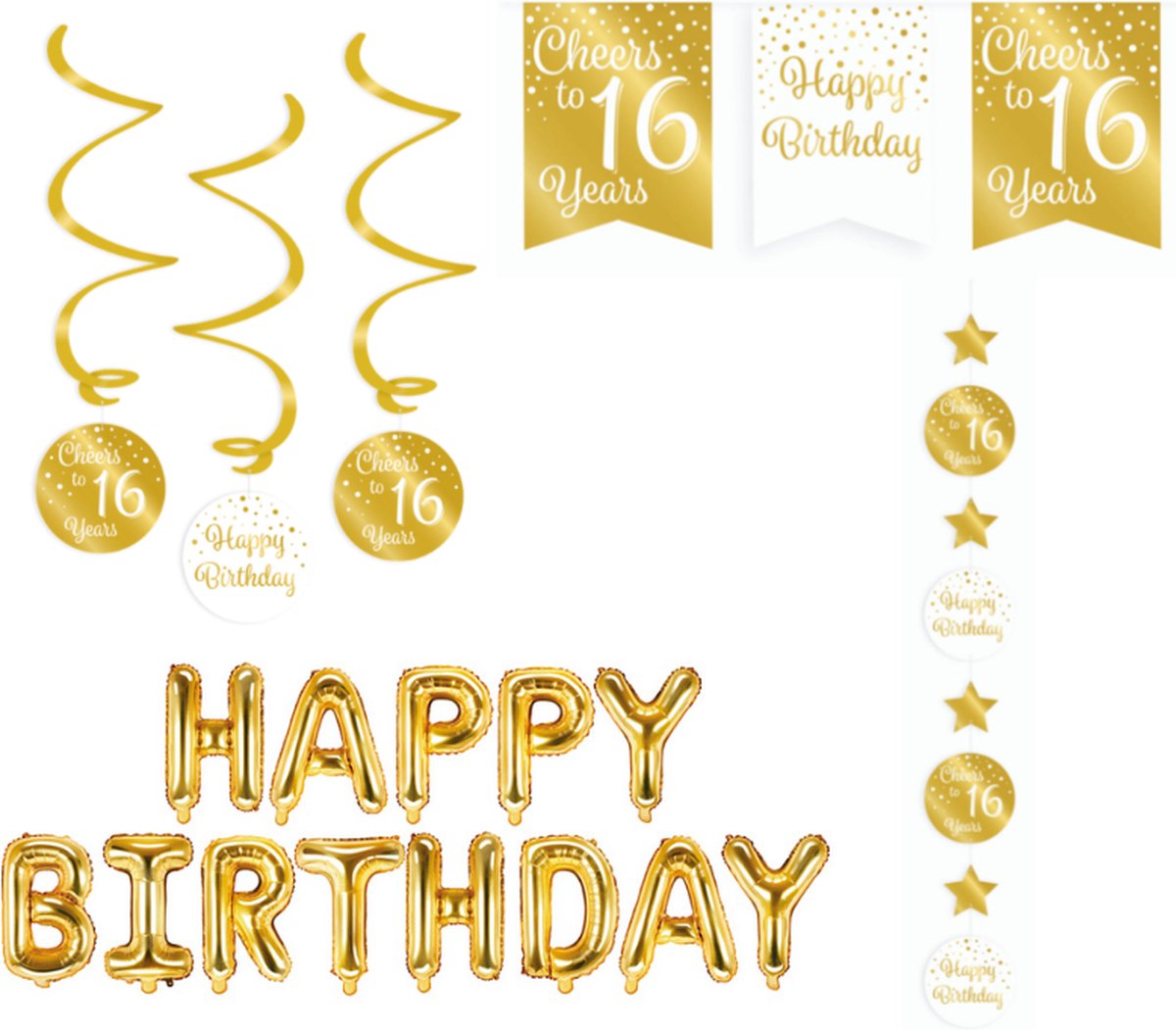 Wordt er iemand 16 jaar en ben je op zoek naar mooie en luxe versiering? Met dit gouden versiering pakket verras je de jarige op een leuke manier. In de verpakking ontvang je drie swirl decoraties, 1 hang decoratie een vlaggenlijn van 6 meter en folieballonnen met de tekst Happy Birthday (340x35cm). Allemaal in mooie goud kleur