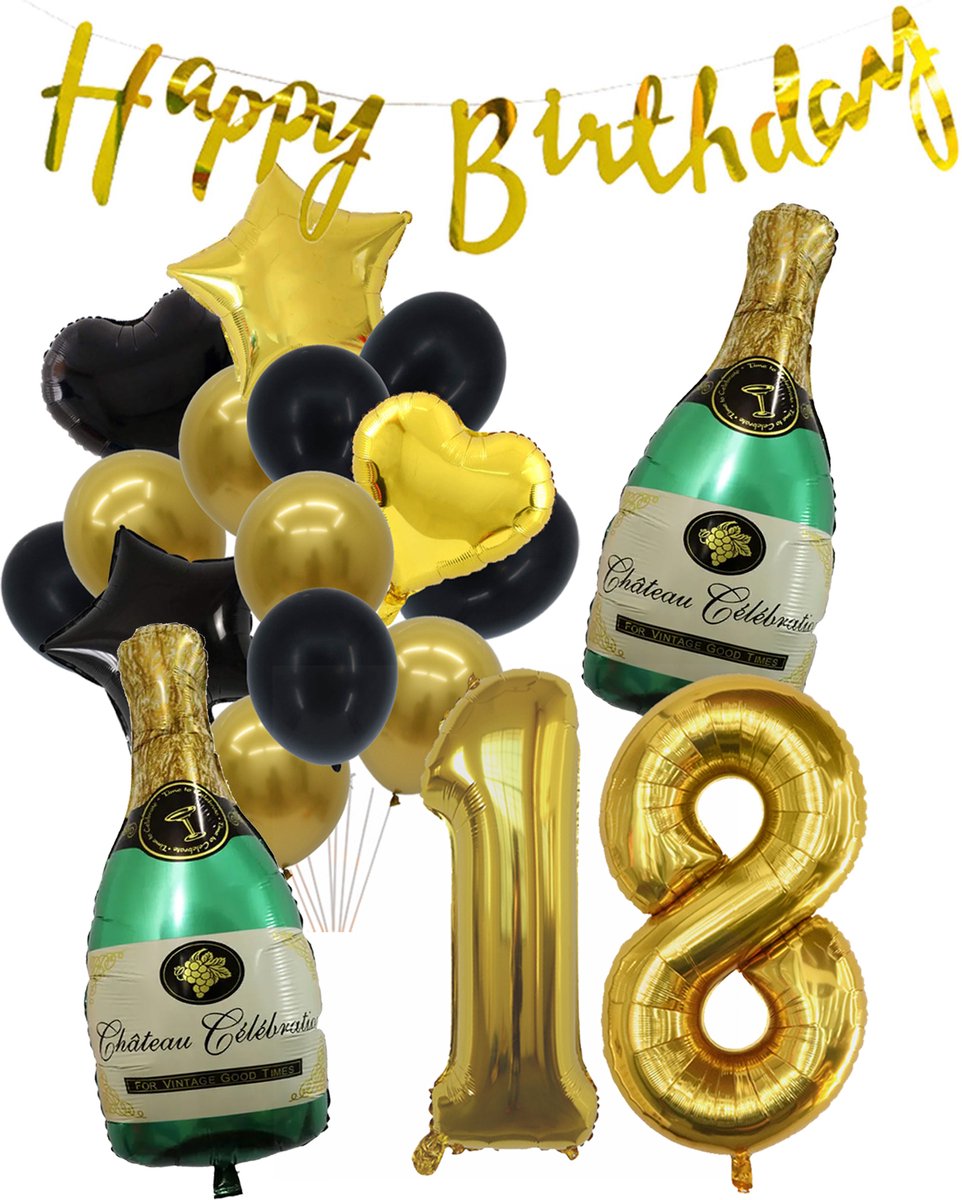 18 Jaar Verjaardag Cijferballon 18 – Feestpakket Snoes Ballonnen Pop The Bottles – Zwart Goud Groen Versiering