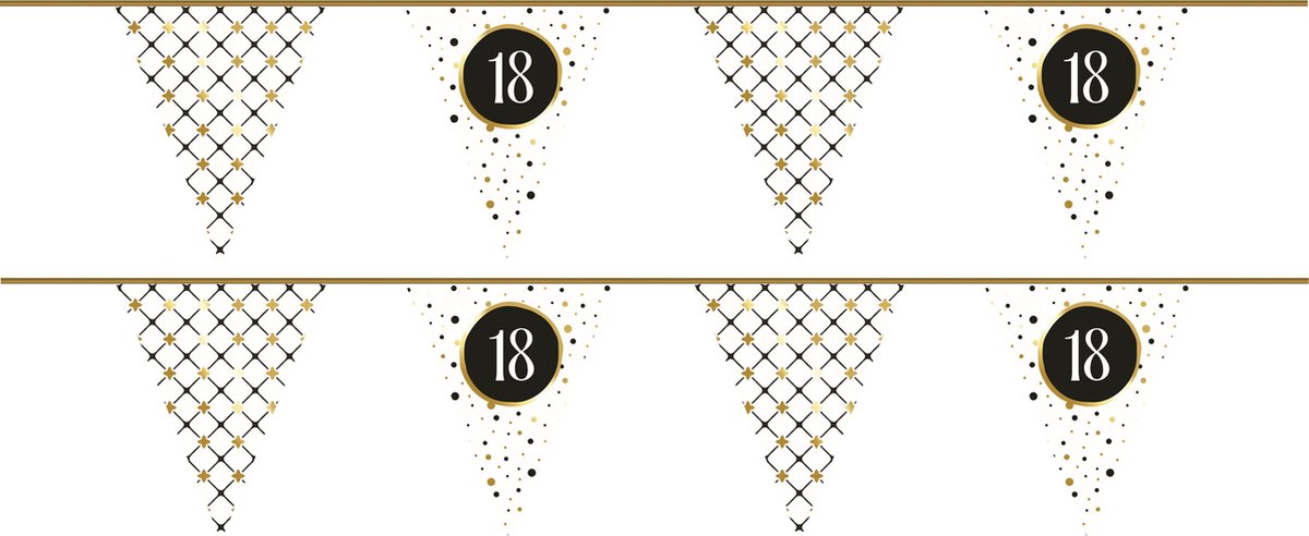 3x leeftijd verjaardag thema vlaggetjes 18 jaar van papier met lengte 600 cm. Leeftijd feestartikelen en versieringen voor de jarige. 18 jaar geworden, dat moet gevierd worden. Zwart/goud kleuren vlaggenlijnen. Totale lengte inclusief ophang snoer is 6 meter. Tweezijdige bedrukking.