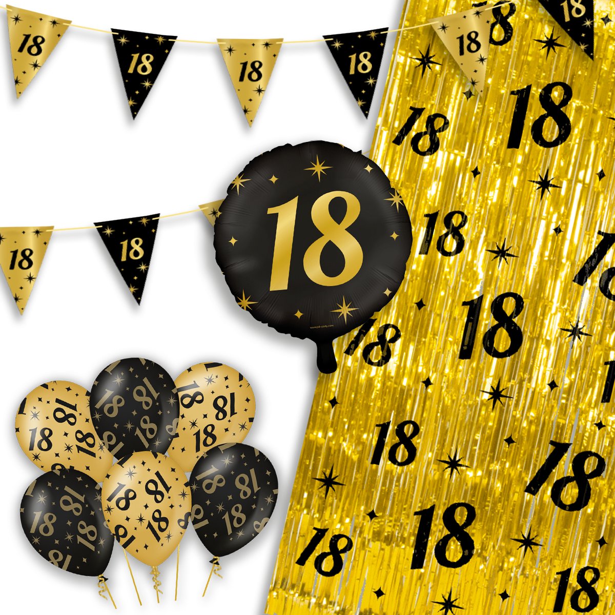 LUQ – Party Essentials 18 Jaar – Zwart-Goud Verjaardag Feest Versiering – Luxe Ballonnen-Slingers-Vlaggenlijn-Gordijn