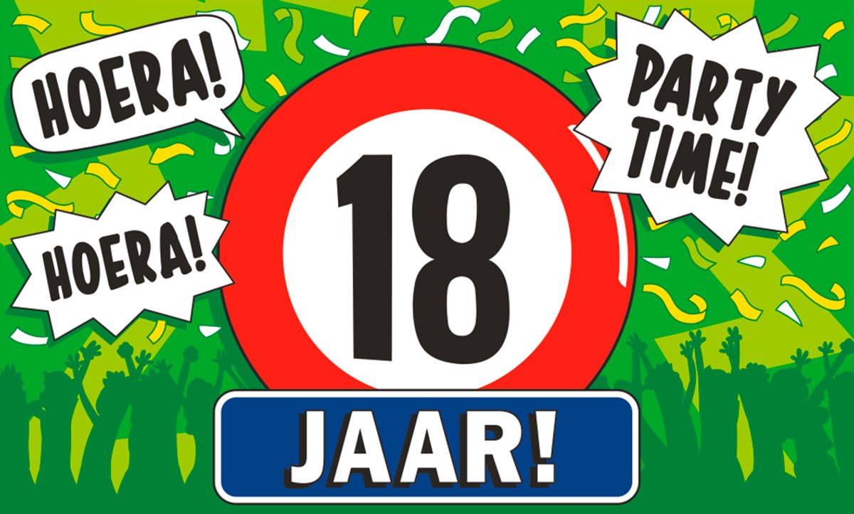 18 jaar? Deze vlag laat iedereen weten dat het feest begonnen is! Met deze kleurrijke vlag ziet iedereen dat jij 18 bent geworden! De knallende kleuren, de grote 18 jaar! print en feestelijke illustraties maken dit tot een echte eyecatcher. Hang ‘m buiten aan het huis of binnen als backdrop – succes gegarandeerd!