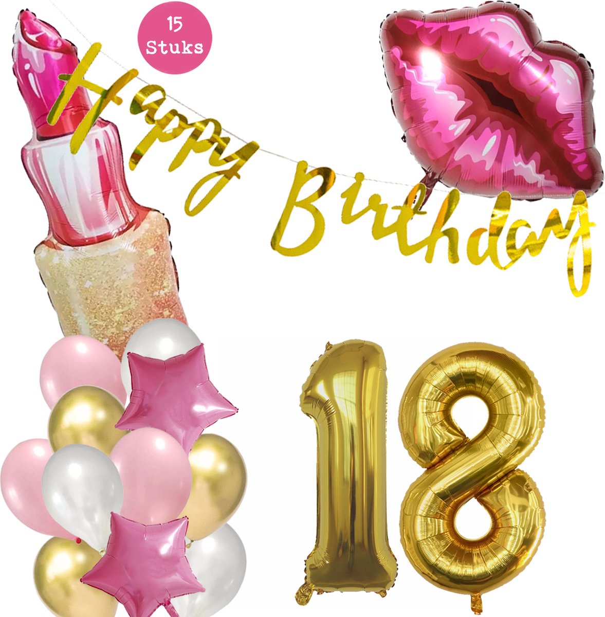 Snoes Beauty Helium Ballonnen Set 18 Jaar – Roze Folieballonnen – Slinger Happy Birthday Goud