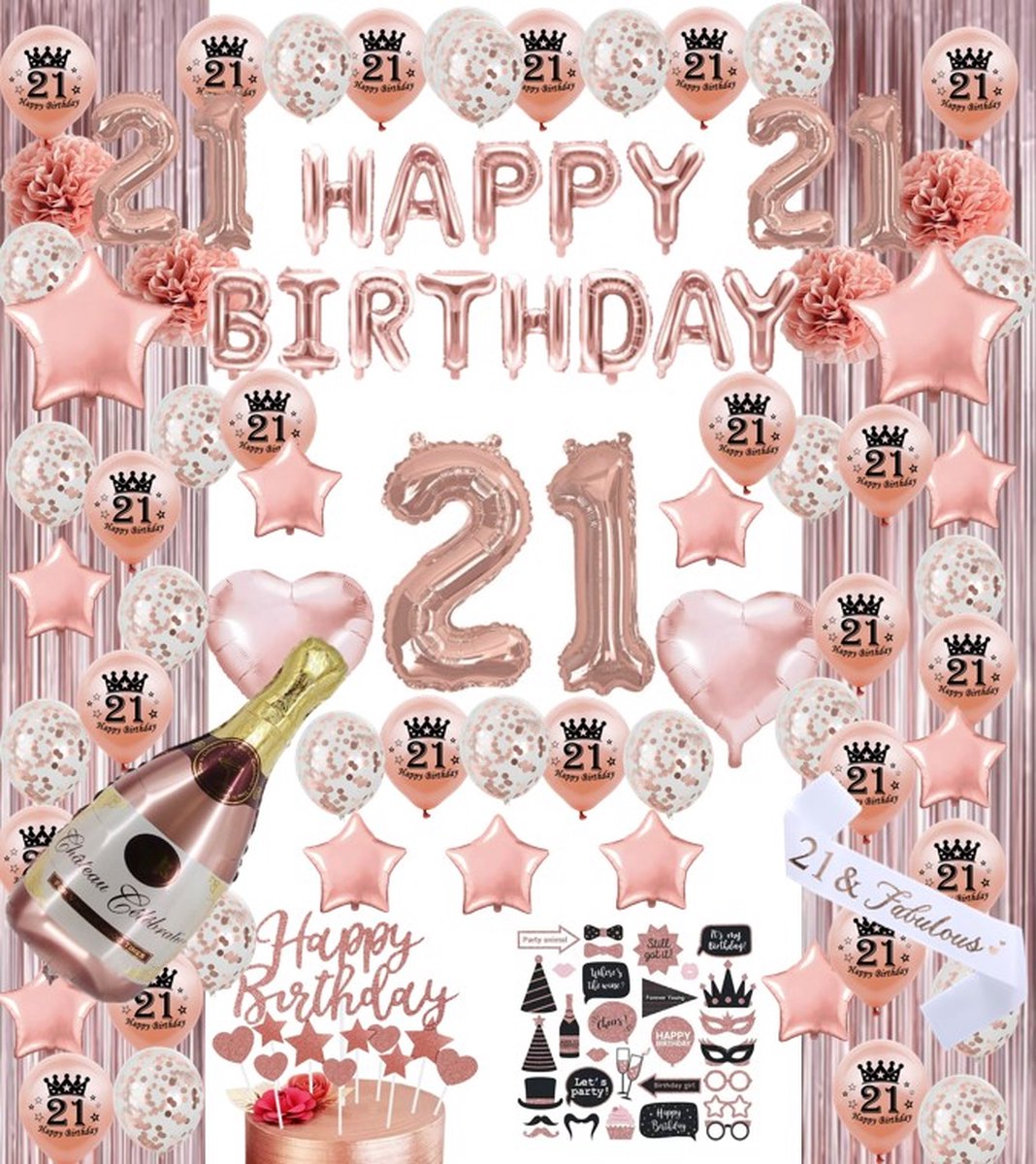 21 jaar verjaardag versiering – 21 Jaar Feest Verjaardag Versiering Set 118-delig – Happy Birthday Slingers, Ballonnen, Foto props & Caketoppers – Decoratie Man Vrouw – Rose goud&Wit