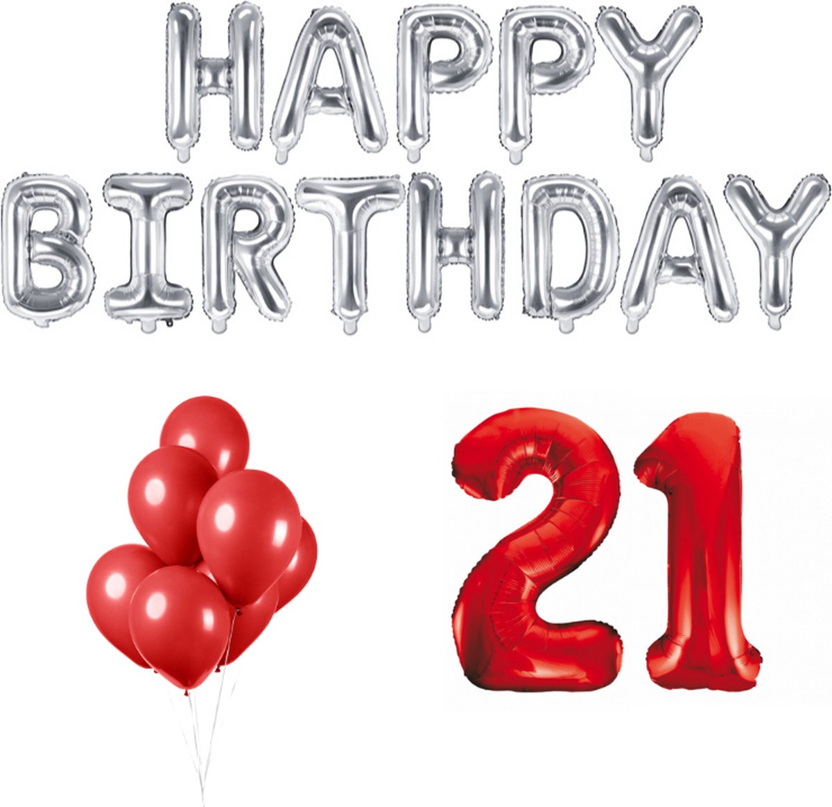 In de verpakking ontvang je cijferballonnen 21 (86cm), 10 Rode ballonnen, Zilver gekleurde Happy Birthday letter ballonnen (340x35cm) en Rood lint van 20 meter.
