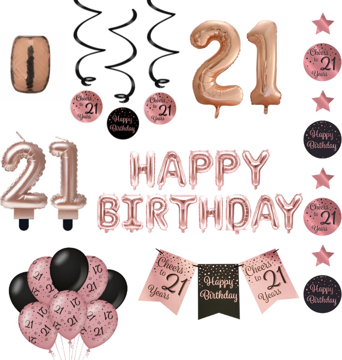 21 jaar Verjaardag Versiering pakket rose gold. Vier je de verjaardag voor iemand die 21 jaar wordt? Met dit verjaardag versiering pakket versier je de verjaardag op een super mooie manier. In de verpakking ontvang je: Happy Birthday folieballon, cijferballon (41cm), lint, 3 Swirl decoraties, Hang decoratie, vlaggenlijn, cijferkaarsen en verjaardag ballonnen.