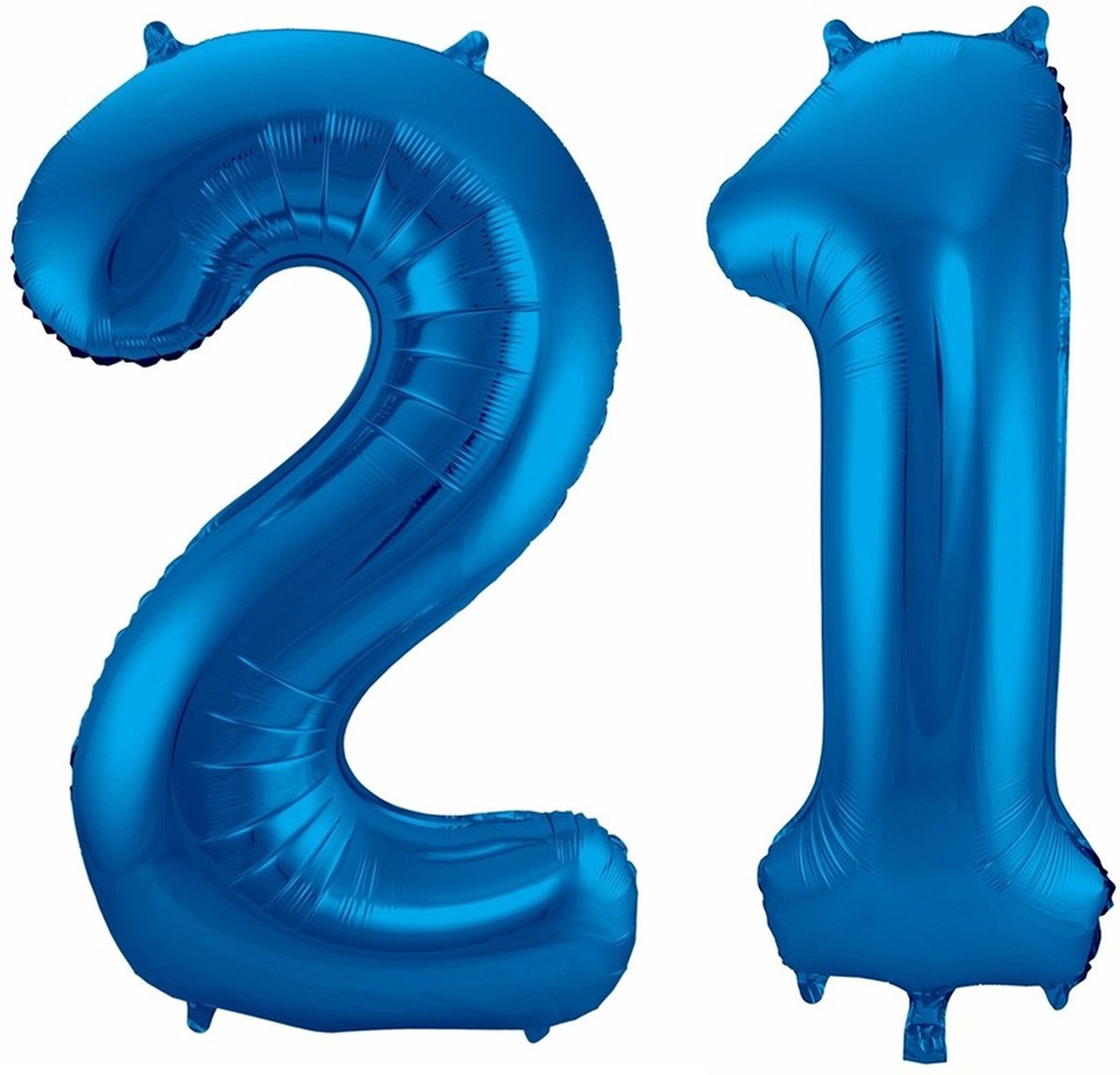 Folie cijfer ballonnen opblaasbaar van cijfer 21. Verjaardag versiering feestartikelen 21 jaar. De ballonnen zijn 85 cm hoog in kleur blauw. Leeftijd feestartikelen voor de jarige. Hang ze opgeblazen op voor het raam. Deze folie ballonnen zijn ook te vullen met Helium. Deze set bestaat uit 2x ballonnen.