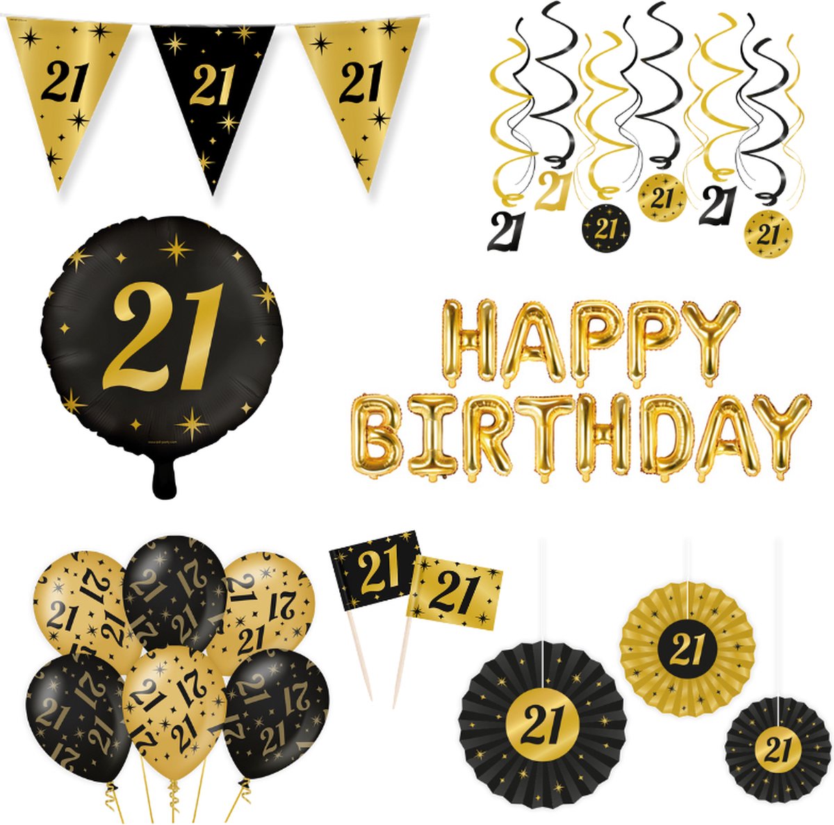 Classy Party 21 jaar verjaardag versiering pakket. Vier een 21 jaar verjaardag op een unieke manier met dit mooie en luxe Classy Party 21 jaar verjaardag versiering pakket in de kleuren goud en zwart. In de verpakking ontvang je een vlaggenlijn van 10 meter, een folieballon (45cm, leeg bezorgd), 6 Swirl decoraties, 3 fan decoraties/ waaiers, 50 cocktailprikkers Folie letterballonnen in de kleur goud (340x35cm, leeg bezorgd), gouden lint en 6 mooie luxe ballonnen (30xm)