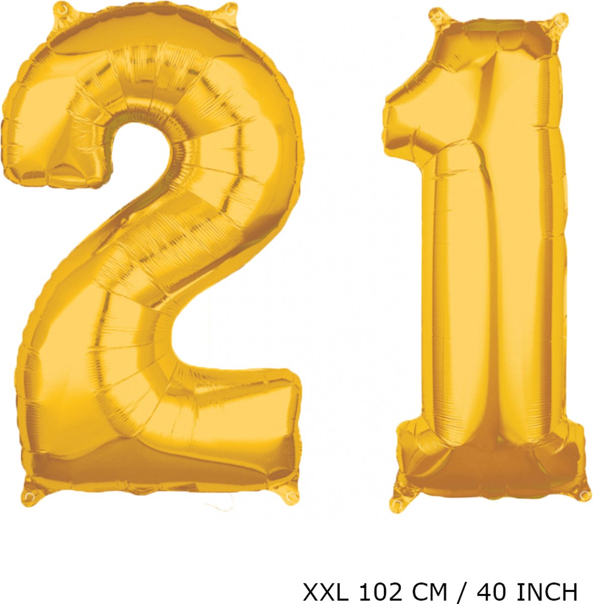 Mega grote XXL gouden folie ballon cijfer 21 jaar. leeftijd verjaardag 21 jaar. 102 cm 40 inch. Met rietje om ballonnen mee op te blazen.