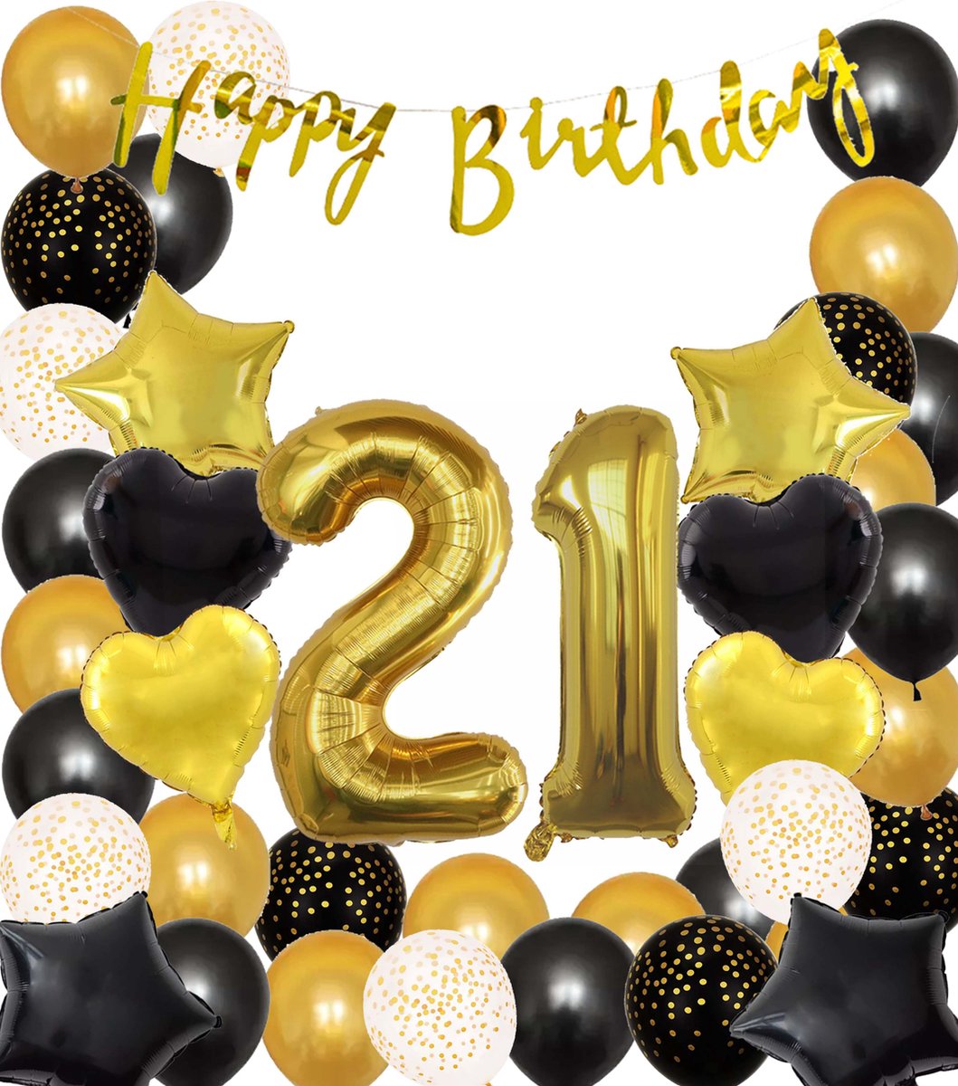 Speciaal voor de jarige zit er ook nog een gouden cijfer ballon 21 in het pakket.