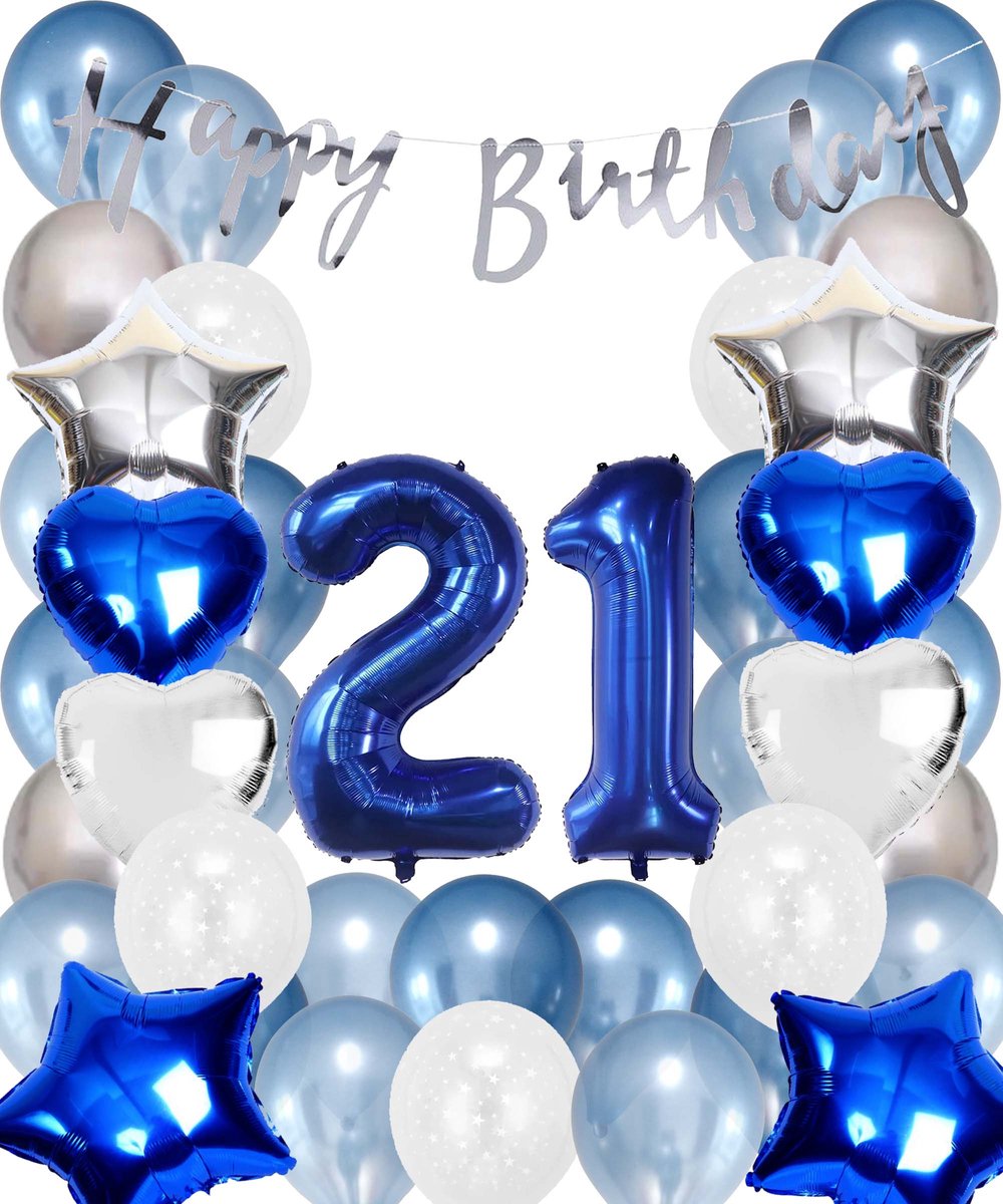 Snoes Ballonnen 21 Jaar Set Mega Blauw Zilver Ballon – Compleet Feestpakket Cijferballon 21 Jaar – Verjaardag Versiering DIY Slinger Happy Birthday – Folieballon – Latex Ballonnen – Helium Ballonnen