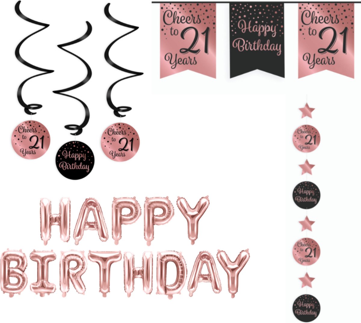 Wordt er iemand 21 jaar en ben je op zoek naar mooie en luxe versiering? Met dit rose gouden versiering pakket verras je de jarige op een leuke manier. In de verpakking ontvang je drie swirl decoraties, 1 hang decoratie een vlaggenlijn van 6 meter en folieballonnen met de tekst Happy Birthday (340x35cm). Allemaal in mooie rose goud kleur