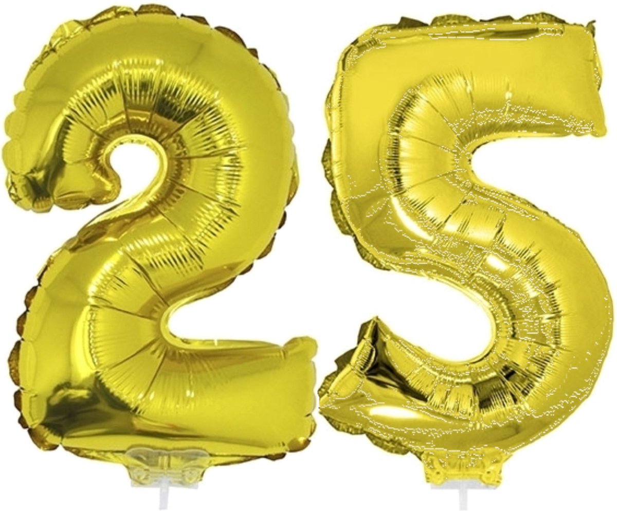 25 jaar leeftijd versiering cijfers – ballonnen op stokje – van 41 cm – Combi van cijfer 25 – in het goud – feestartikelen verjaardag
