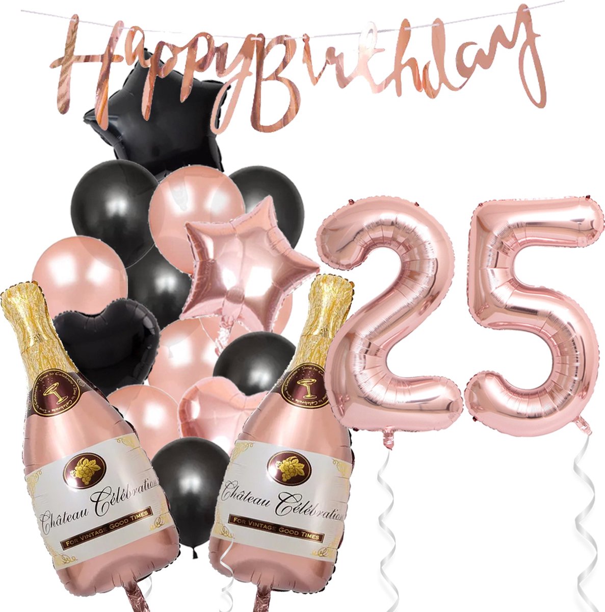 25 Jaar Verjaardag Cijferballon 25 – Feestpakket Snoes Ballonnen Pop The Bottles – Rose Zwart Versiering