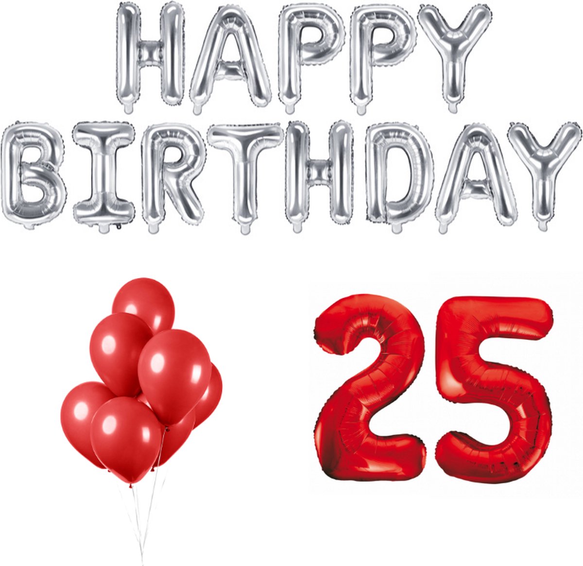 In de verpakking ontvang je cijferballonnen 25 (86cm), 10 Rode ballonnen, Zilver gekleurde Happy Birthday letter ballonnen (340x35cm) en Rood lint van 20 meter.