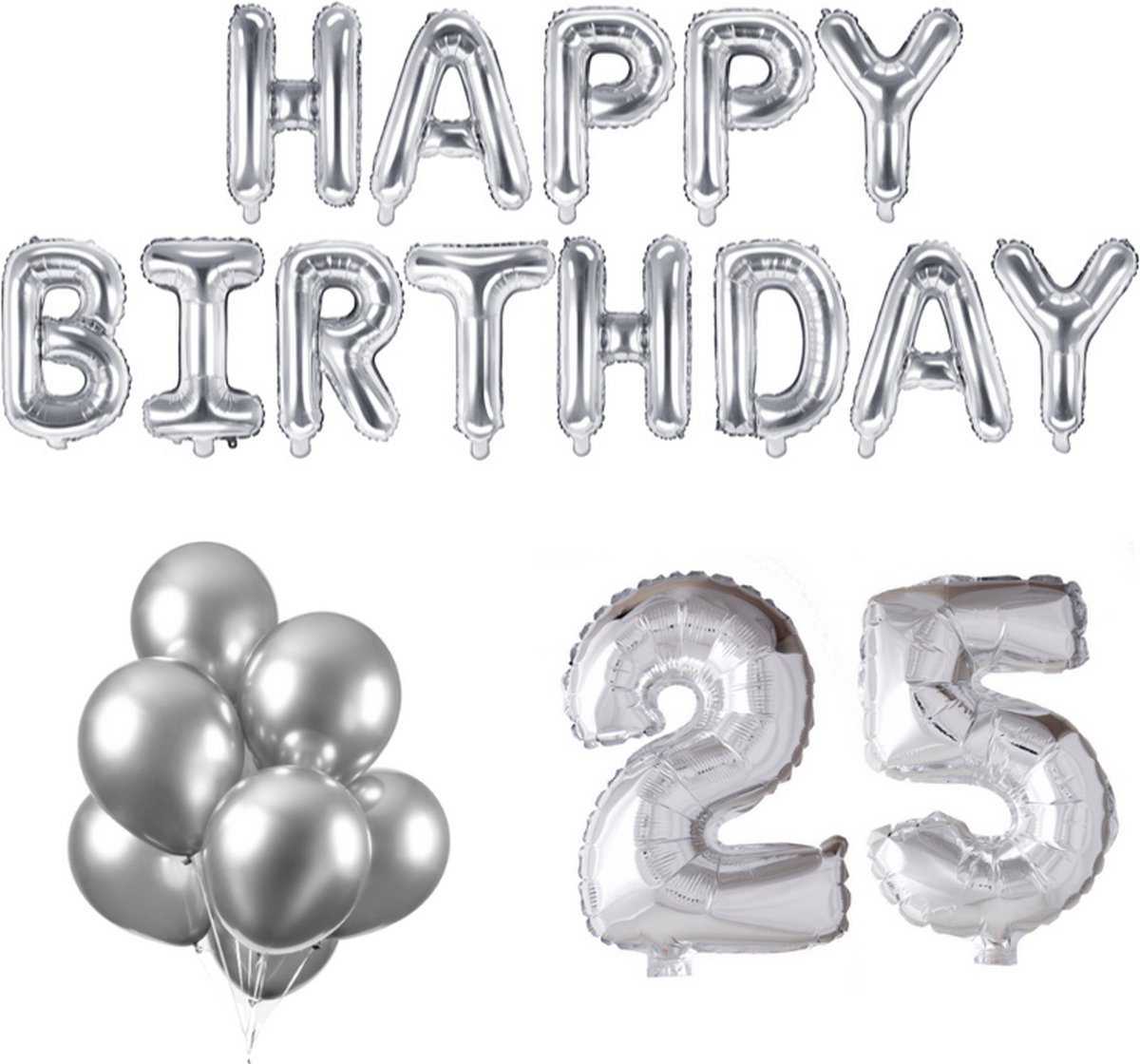 In de verpakking ontvang je cijferballonnen 25 (66cm), 10 Zilveren spiegel ballonnen, Zilveren Happy Birthday letter ballonnen (340x35cm) en Zilveren lint van 20 meter.