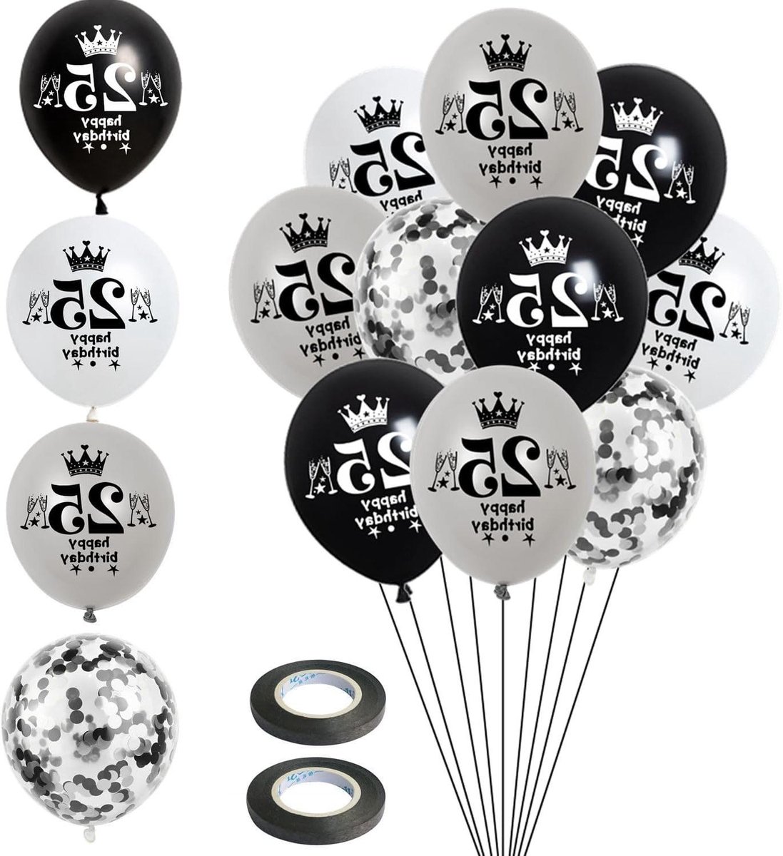 25 jaar verjaardagsdecoraties in zwart, grijs en wit. De set bevat 32 latexballonnen van 30 cm: 8 zwarte Happy 25 Birthday ballonnen, 8 grijze Happy 25 Birthday ballonnen, 8 witte Happy 25 Birthday ballonnen, 8 confettiballonnen en 2 linten ballonnen.