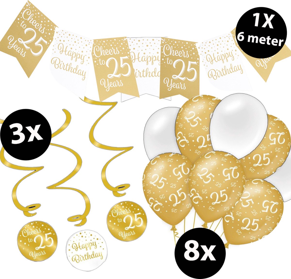 Verjaardag versiering pakket goud & wit – 25 Jaar Mooie gouden en witte verjaardags versiering set met 8 ballonnen en 1 slinger vlaggenlijnen van 8 meter lang. Goede kwaliteit ballonnen die dagenlang goed blijven. Slingers gaan jarenlang mee voor een eventuele volgende verjaardag.