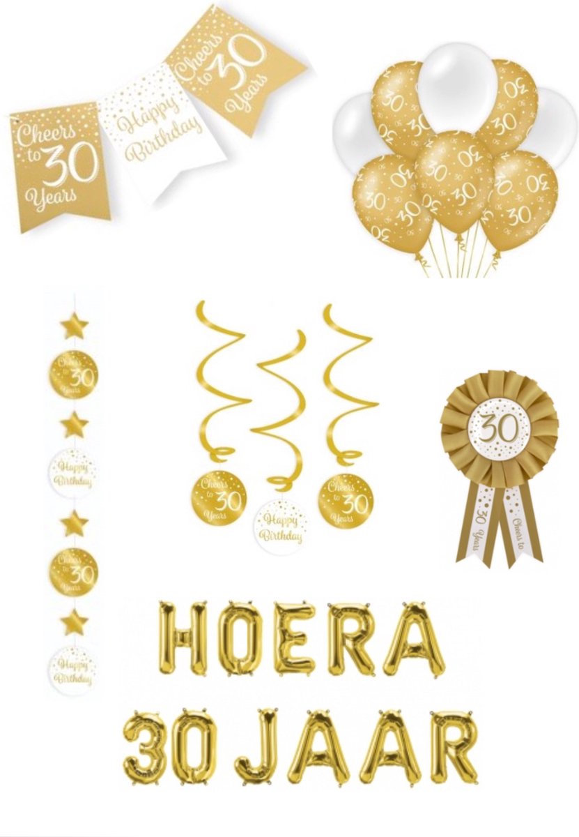 30 jaar verjaardag versiering pakket – goud wit – ballon – vlag – paperdreams