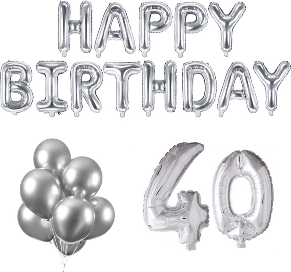 In de verpakking ontvang je cijferballonnen 40 (66cm), 10 Zilveren spiegel ballonnen, Zilveren Happy Birthday letter ballonnen (340x35cm) en Zilveren lint van 20 meter.