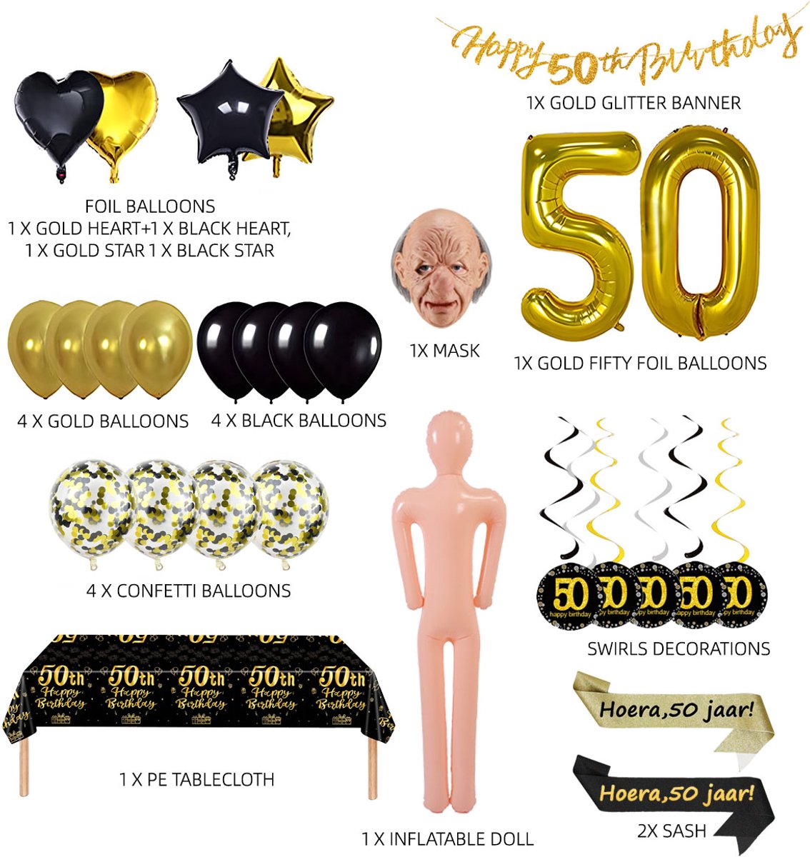 Maak van de 50e verjaardag een onvergetelijk feest met dit complete 50 jaar feestpakket! Deze feestset bevat alles wat je nodig hebt om groots uit te pakken: van kleurrijke ballonnen en feestelijke slingers tot een opvallend tafelkleed en een grappige opblaaspop (1,50 meter hoog).