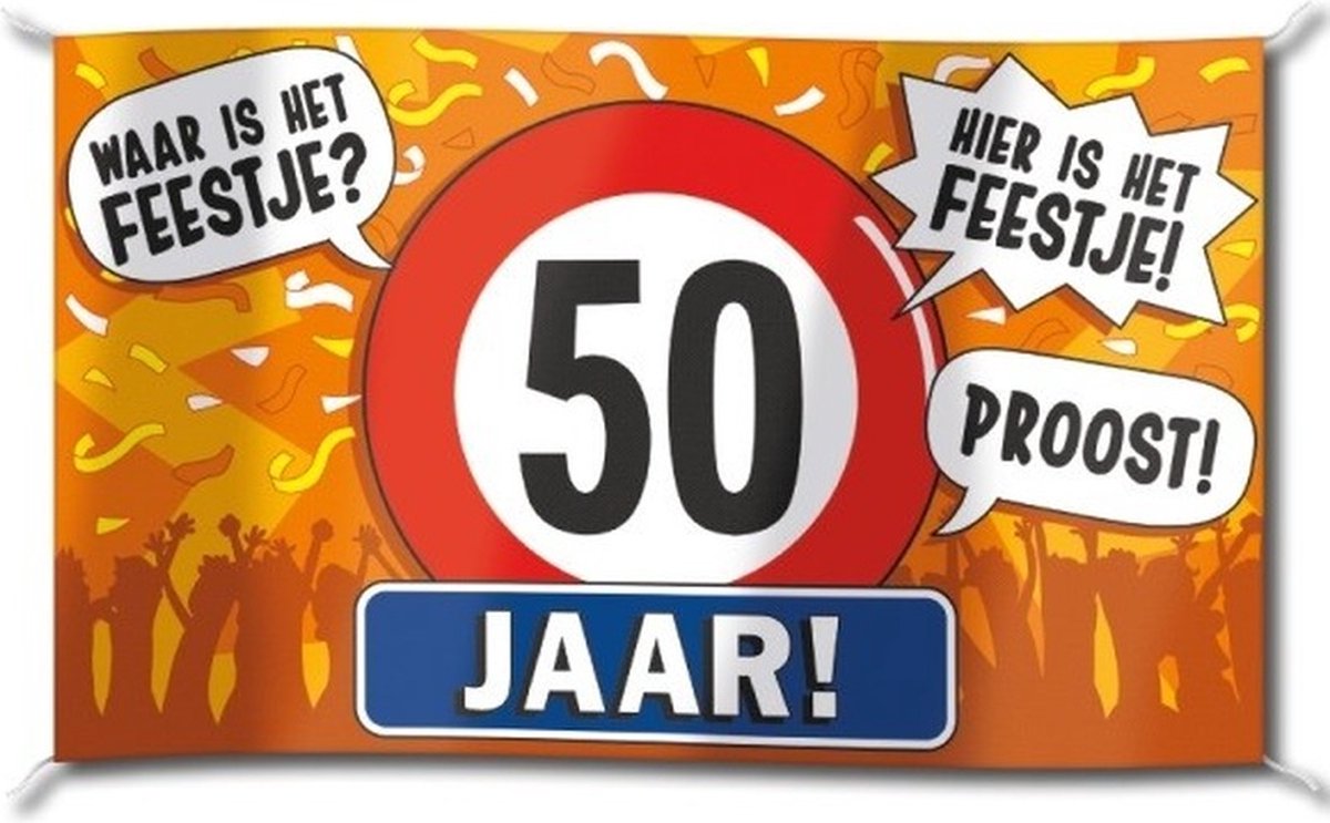Gevelvlag verjaardag van leeftijd 50 jaar geworden, met afmetingen van 100 x 150 cm. Gekleurde gevelvlag voor een 50e verjaardag. De gevelvlag heeft aan elke hoek twee touwtjes van ongeveer 14 cm lang om ergens aan vast te knopen. Het doek is geschikt om binnen of buiten op te hangen. Materiaal: polyester. Formaat: ongeveer 100 x 150 cm.