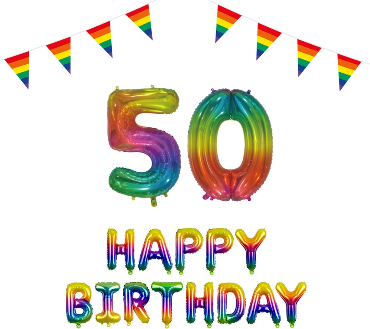 In de verpakking ontvang je cijferballonben 50 (76cm), Happy Birthday Regenboog Folieballonnen, 2 Regenboog vlaggenlijnen van 10 meter en een roze lint van 20 meter.