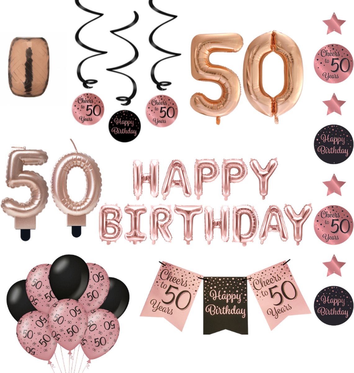 50 jaar Verjaardag Versiering pakket rose gold. Vier je de verjaardag voor iemand die 50 jaar wordt? Met dit verjaardag versiering pakket versier je de verjaardag op een super mooie manier. In de verpakking ontvang je: Happy Birthday folieballon, cijferballon (41cm), lint, 3 Swirl decoraties, Hang decoratie, vlaggenlijn, cijferkaarsen en verjaardag ballonnen.