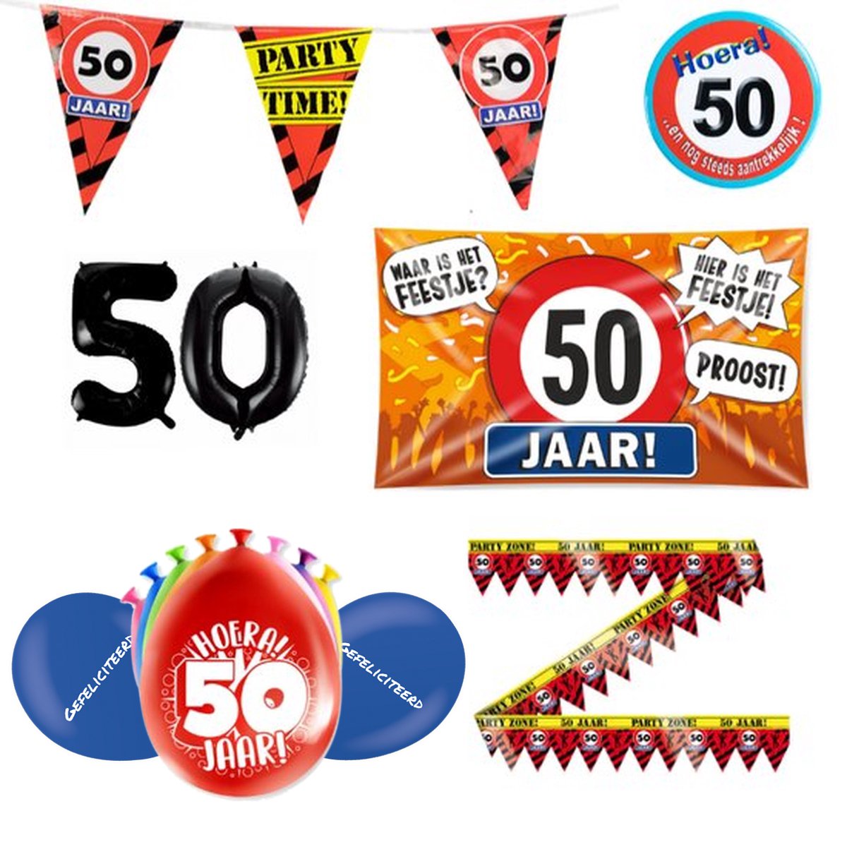 50 jaar versiering pakket – Versiering Verjaardag – Versiering 50 Jaar Verjaardag – Slingers – Gevelvlag – Ballonnen – Afzetlint – FolieBallon – Button