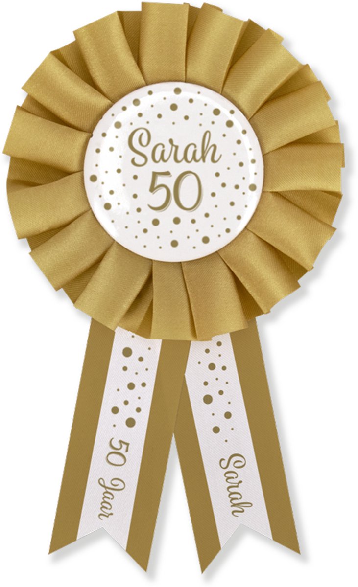 Uniek ontwerp: Broche met “Sarah 50 jaar” bedrukt voor extra feestgevoel.