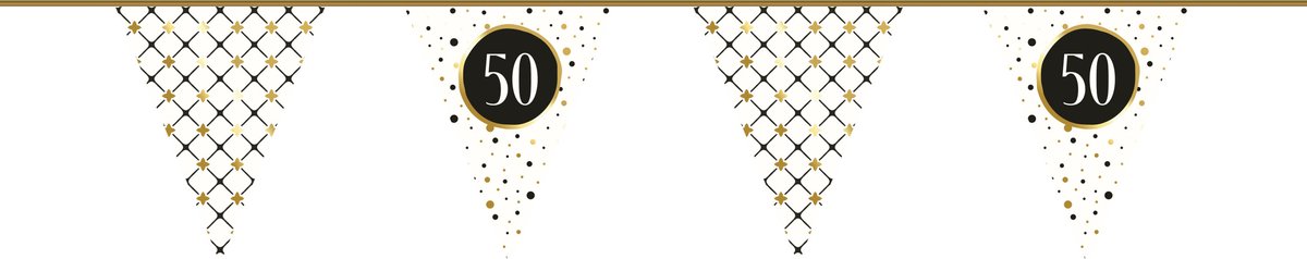 3x leeftijd verjaardag thema vlaggetjes 50 jaar van papier met lengte 600 cm. Leeftijd feestartikelen en versieringen voor de jarige. 50 jaar geworden, dat moet gevierd worden. Zwart/goud kleuren vlaggenlijnen. Totale lengte inclusief ophang snoer is 6 meter. Tweezijdige bedrukking.
