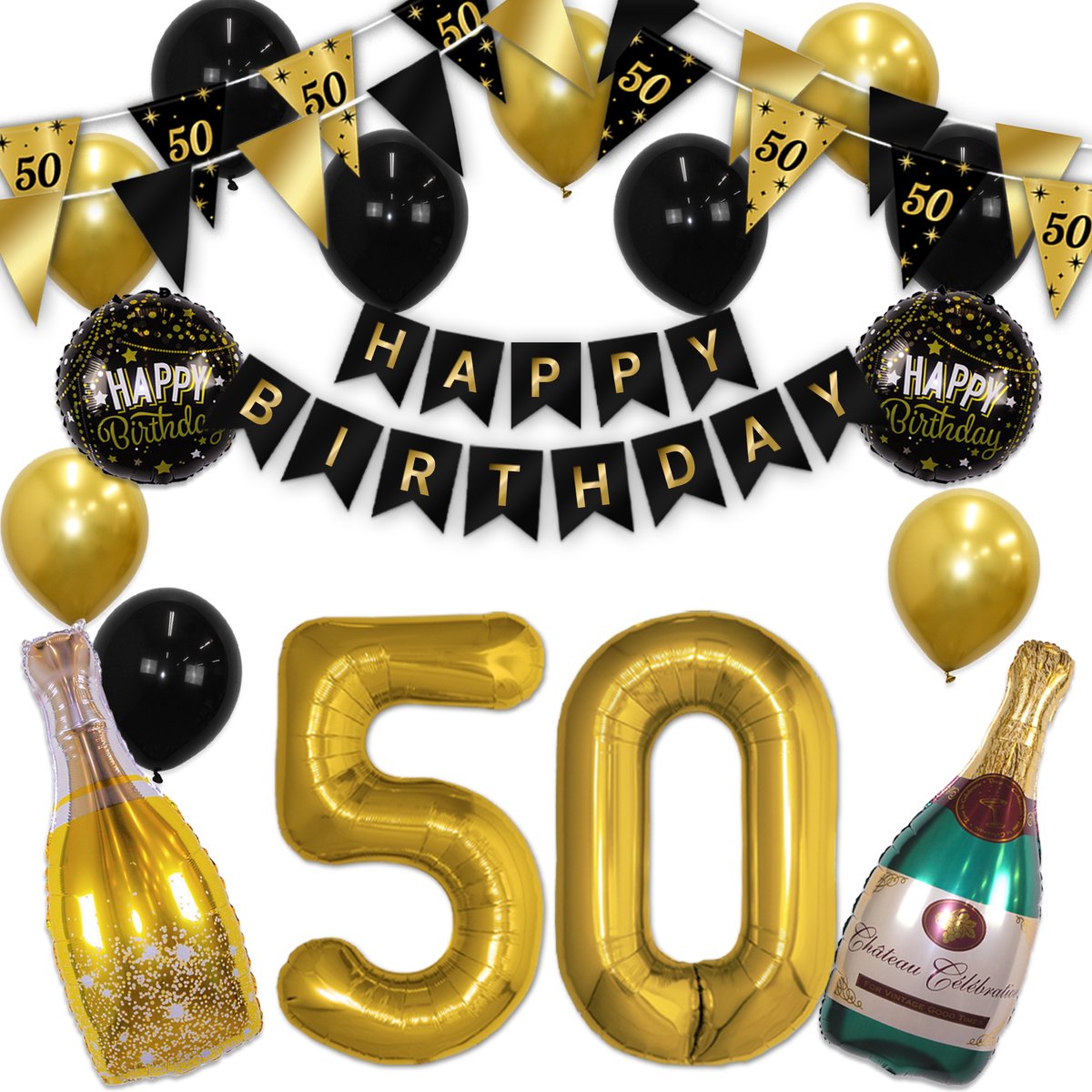 Q2P – 50 Jaar – Verjaardag Versiering – Helium Ballonnen – Feest Pakket – Happy Birthday – Versiering – Zwart & Goud