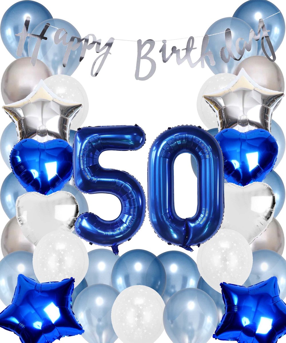 Snoes Ballonnen 50 Jaar Set Mega Blauw Zilver Ballon – Compleet Feestpakket Cijferballon 50 Jaar – Verjaardag Versiering Slinger Happy Birthday – Folieballon – Latex Ballonnen – Helium Ballonnen