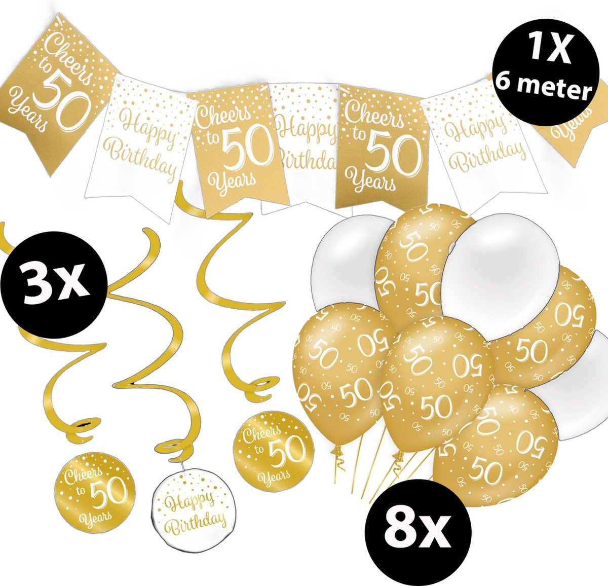 Verjaardag versiering pakket goud & wit – 50 Jaar Mooie gouden en witte verjaardags versiering set met 8 ballonnen en 1 slinger vlaggenlijnen van 8 meter lang. Goede kwaliteit ballonnen die dagenlang goed blijven. Slingers gaan jarenlang mee voor een eventuele volgende verjaardag.