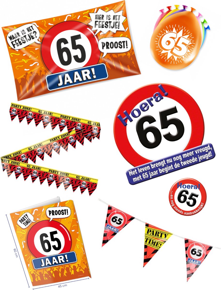 Het feestpakket met 65 jaar versiering bestaat uit vele verschillende leuke versieringen. Alles wat je nodig hebt voor een geslaagde verjaardag zit in dit pakket.