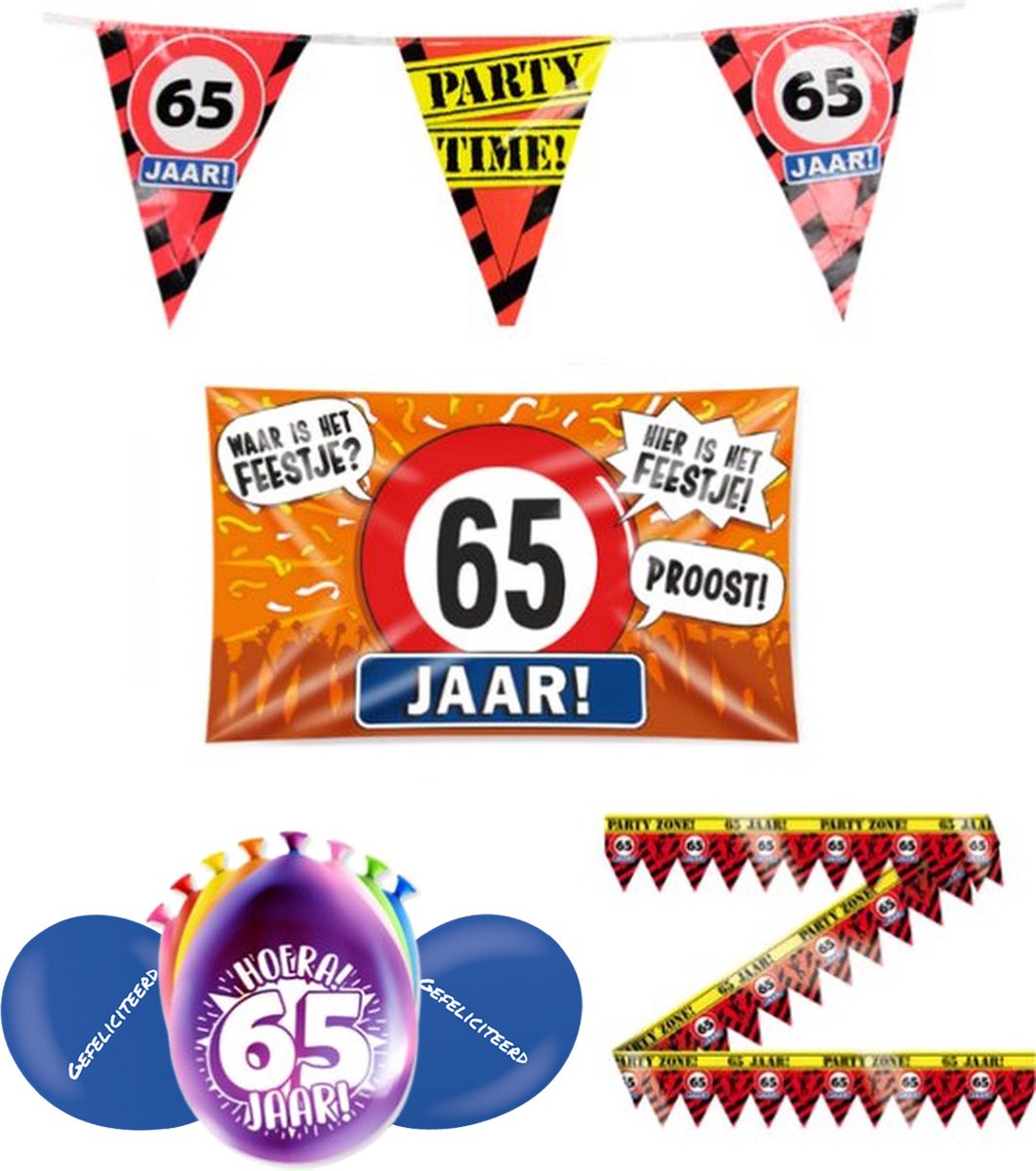 65 jaar versiering pakket – Versiering Verjaardag – Versiering 65 Jaar Verjaardag – Slingers – Gevelvlag – Ballonnen – Afzetlint – FolieBallon – Button