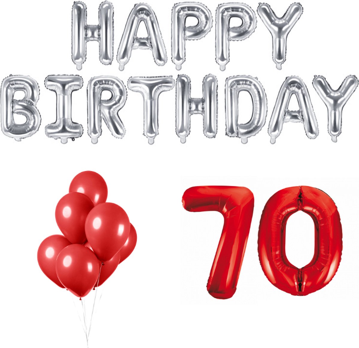In de verpakking ontvang je cijferballonnen 70 (86cm), 10 Rode ballonnen, Zilver gekleurde Happy Birthday letter ballonnen (340x35cm) en Rood lint van 20 meter.
