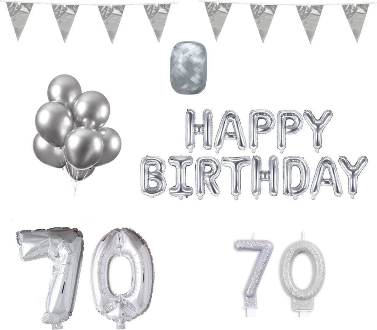In de verpakking ontvang je cijferballonnen 70 (66cm), 2 metallic Zilveren slingers van 10 meter, 10 Zilveren spiegel ballonnen (30cm), Zilveren Happy Birthday letter ballonnen (340x35cm), Zilveren lint en een Zilveren glitter taartkaars cijfers 70 (5cm hoog)